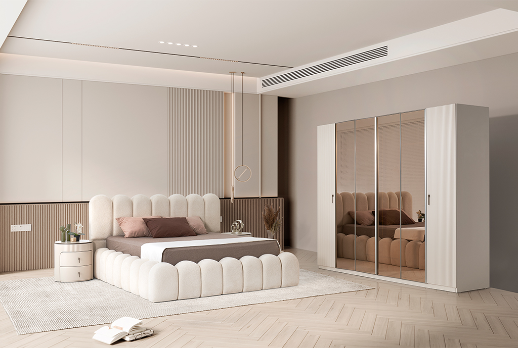 6 kapaklı dolap, bazalı karyola, 2 adet komodin ve 1 adet şifonyer ve aynasından oluşmaktadır.